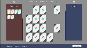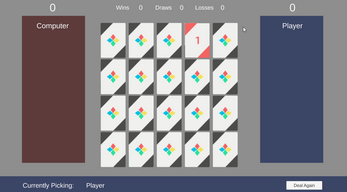 Assignment: create a memory-match game with some sort of player pressure; I elected to script a simple AI that remembers what cards have been turned on the board and picks accordingly. The player can wipe out the enemy AI's memory bank by missing enough guesses, giving less astute players a hand up in their battle against the CPU.